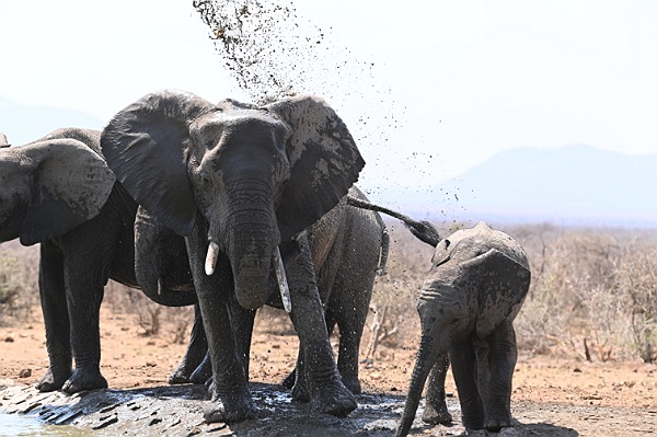 En dat het dichtbij is merken we als één van de grotere dikhuiden lekker met modder begint te sproeien, zowel over de eigen rug als ook door de kijkspleet rechtstreeks de bunker in. Niet alleen alles in de bunker zit onder de modder, maar ook wij en de kleding die we dragen en zelfs onze camera's. Alles zit onder de blubber. Gelukkig blijkt het na opdrogen redelijk goed schoon te maken. Alles natuurlijk onder grote hilariteit van onze reisgenoten.