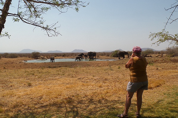 Na de 'brunch' hebben we een paar uurtjes de tijd voor onszelf. Geruime tijd hiervan zitten we lekker op een stoel die we naar de rand van de tuin slepen om een goed zicht op de waterplas te hebben. Van alles komt drinken. Zebra's, gnoe's, wrattenzwijnen en een grote variatie aan antilope's zien we naar het water komen. Als er op een gegeven moment een aantal olifanten aan komt lopen, wandelen wij naar de bunker om dit van dichtbij mee te maken.