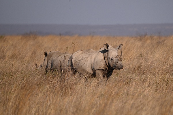 Niet ver van ons vandaan staan twee neushoorns.