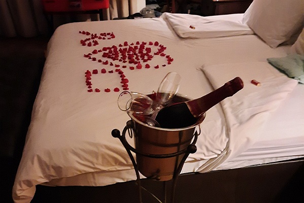 Tijdens de game drive hebben we laten vallen dat we deze reis mede maken om ons 45-jarig jubileum te vieren. Bij terugkeer in onze kamer worden we toch een beetje overvallen. Op het bed zijn in een leuke vorm rode bloemblaadjes gelegd en er staat een ijsemmer met een fles wijn, begeleid door een felicitatiekaart. Wat een leuke geste. Wij zijn geen wijndrinkers en kunnen de fles ook niet meenemen dus wordt deze op tafel gezet waar onze reisgenoten er van kunnen genieten.